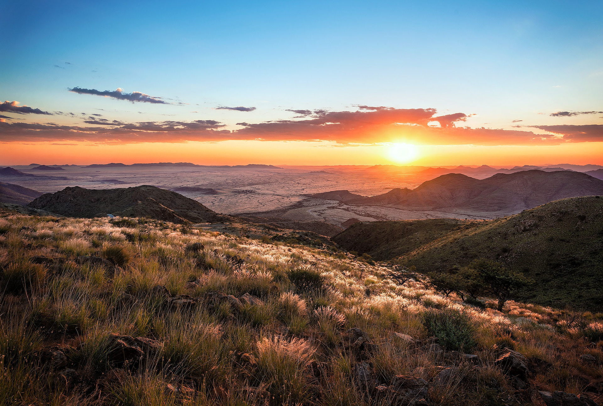 The view from the pass as the sun sets over the dunes of the Namib desert.