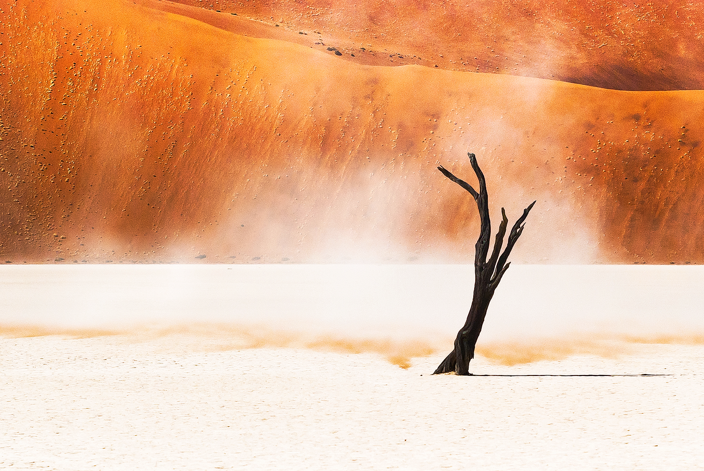 A moment captured as the sand sweeps over the Deadvlei pan winding its way between the petrified trees.
