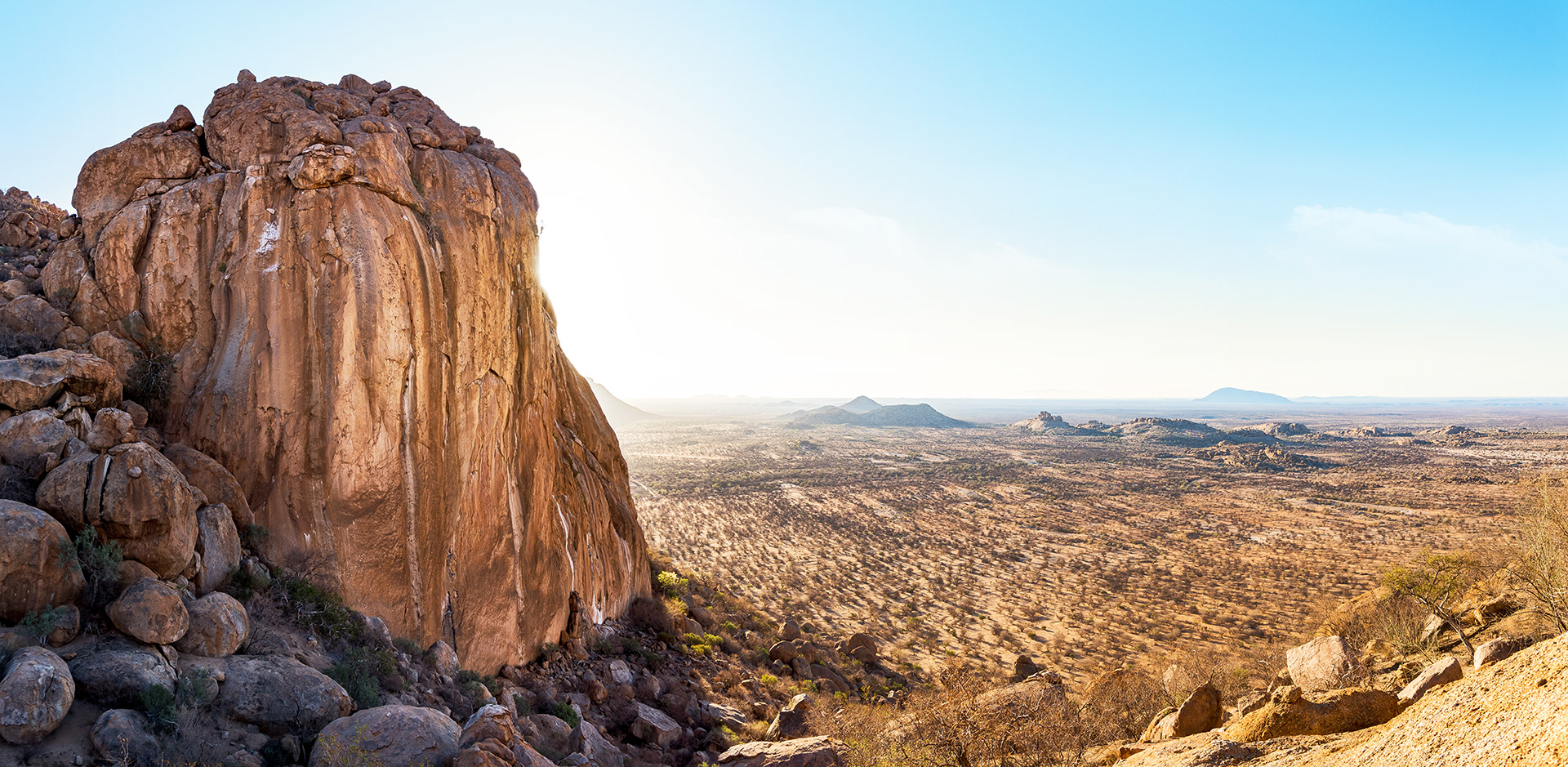An enormous granite rock formed after a huge volcano collapsed more than a 120 million years ago now towers over the valley below. Erongo Mountains, Namibia.
